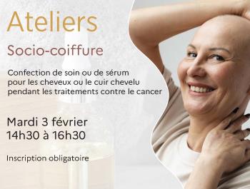 un atelier "socio-coiffure", confection de soin ou de sérum pour les cheveux ou le cuir chevelu de 14h30 à 16h30.