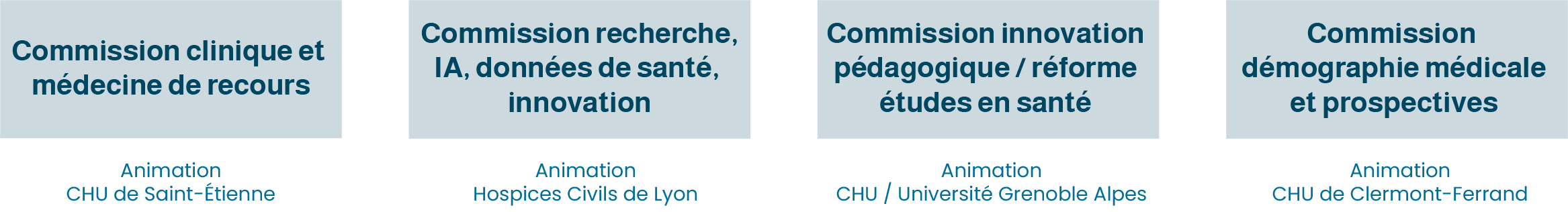 Le GCS HOURAA est structurée en quatre commissions thématiques, correspondant aux axes stratégiques du groupement, animées chacune par un établissement membre